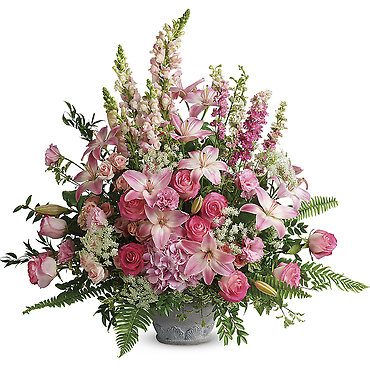 Honor your beautiful memories with this exuberant collection of peaceful pink arrangements. Gloriously soft and feminine, the seven hand-made sympathy pieces inspire the service. The Beautiful Memories Collection includes the following seven sympathy set pieces:
