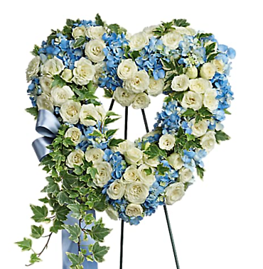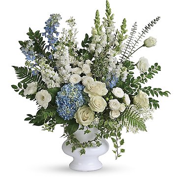 Featuring four hand-made sympathy pieces, this breathtaking collection of sky blue and pure white blooms is a touching tribute to your tender memories. The Tender Remembrance Collection includes the following four sympathy set pieces: