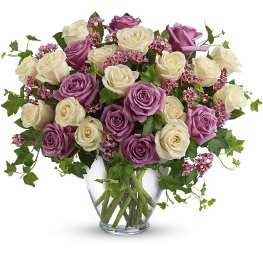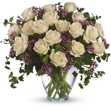 Send an English garden someone's way with this gorgeous arrangement. Tendrils of green ivy trail delicately from a beautiful bunch of creamy roses and purple waxflower for a bouquet that's both traditional and unexpected.